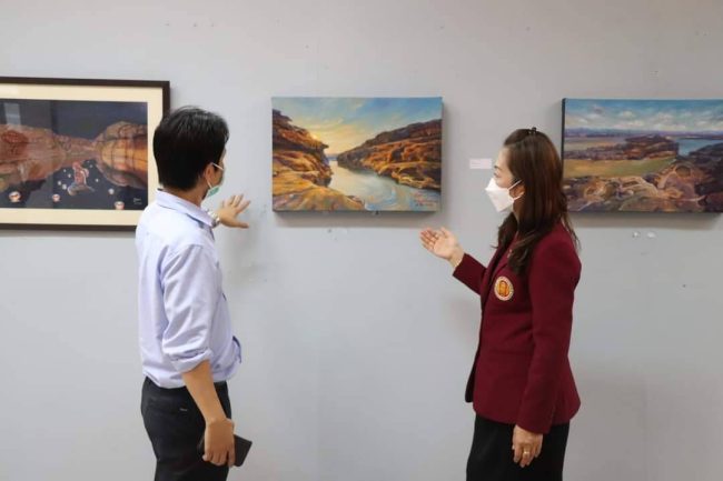 จากนั้นเป็นพิธีเปิดการจัดแสดงนิทรรศการผลงานศิลปะจากกลุ่มศิลปินอีสานตอนล่าง สมาคมศิลปินอีสาน โดยมีผลงานที่นำมาจัดแสดงจำนวน 60 ผลงาน อาทิ ผลงานของ อ.โชคชัย ตักโพธิ์ ศิลปินมรดกอีสาน เจ้าของ รางวัล “ครูยิ่งคุณ” จากมูลนิธิสมเด็จเจ้าฟ้ามหาจักรี ครั้งที่ 4 ประจำปี 2564 ผลงานที่จัดแสดงชื่อ “แก่งกะเบา” พร้อมด้วย อ.จุฑา ขำเปรมศรี ผลงาน “สามพันโบก” อ.สันติ ทองสุข ผลงาน “ผาซันอุบล” อ.เทอดศักดิ์ ไชยกาล ผลงาน “ขอบฟ้าที่สามพันโบก” “วิถีชาวบ้านสามพันโบก” “ยกมือท้าวฟ้าที่สามพันโบก” เป็นต้น ทั้งนี้กำหนดจัดแสดงใน ระหว่างวันที่ 15 มิถุนายน -16 กรกฎาคม 2565 ณ หอศิลป์ราชธานีศรีวนาไล วิทยาลัยอาชีวศึกษาอุบลราชธานี ในวันและเวลาราชการ พร้อมนำผลงานศิลปะจากศิลปินทั้งหมดนำมาประมูลเพื่อหารายได้ส่วนหนึ่งมาพัฒนาสมาคมในการสืบสานงานศิลปะต่อไป อีกทั้งยังเป็นการส่งเสริมและสนับสนุนการท่องเที่ยวของจังหวัดอุบลราชธานีในช่วงเทศกาลประเพณีแห่เทียนพรรษาของจังหวัดอุบลราชธานีอีกด้วย