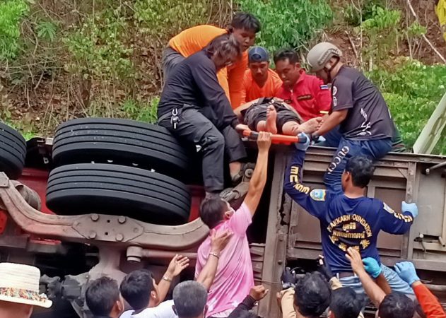 วันนี้ 03 มิ.ย. 2566 ผู้สื่อข่าวรายงานว่า พนักงานสอบสวน สภ.ศรีสวัสดิ์ จ.กาญจนบุรี ได้รับแจ้งจากศูนย์วิทยุ 191 ว่าเกิดอุบัติเหตุรถทัวร์นำเที่ยว 2 ชั้นเสียหลักพลิกคว่ำที่บริเวณทางลงเนินเขาตับเต่า ท้องที่หมู่ 4 ต.ท่ากระดาน อ.ศรีสวัสดิ์ จ.กาญจนบุรี หลังรับแจ้งจึงรายงานผู้บังคับบัญชาทราบโดยร้อยโททศพล ไชยโกมินทร์ ผู้ว่าราชการจังหวัดกาญจนบุรี นายธนยศ หิรัญเนตร นายอำเภอศรีสวัสดิ์ ได้สั่งการให้ นายภาณุ ทองปนแก้ว ปลัดอำเภอศรีสวัสดิ์ นำกำลังเจ้าหน้าที่อำเภอศรีสวัสดิ์ ไปให้ความช่วยเหลือ ร่วมกับนายประวัฒน์ พวงทอง หัวหน้าอุทยานแห่งชาติเอราวัณ พร้อมกำลังเจ้าหน้าที่อุทยานแห่งชาติเอราวัณ และกำลังเจ้าหน้าที่มูลนิธิพิทักษ์กาญจน์ หลายสิบนาย นำอุปกรณ์เครื่องตัดถ่างและเปลไปลำเลียงนำผู้บาดเจ็บส่งไปรักษาเบื้องต้นที่โรงพยาบาลที่อยู่ใกล้เคียง ซึ่งประกอบด้วย รพ.ท่ากระดาน และ รพ.ส่งเสริมสุขภาพตำบลบ้านเอราวัณ จากนั้นจึงลำเลียงผู้ได้รับบาดเจ็บส่งไปรักษาต่อที่โรงพยาบาลพหลพลพยุหเสนา ซึ่งเป็นโรงพยาบาลประจำจังหวัดกาญจนบุรี