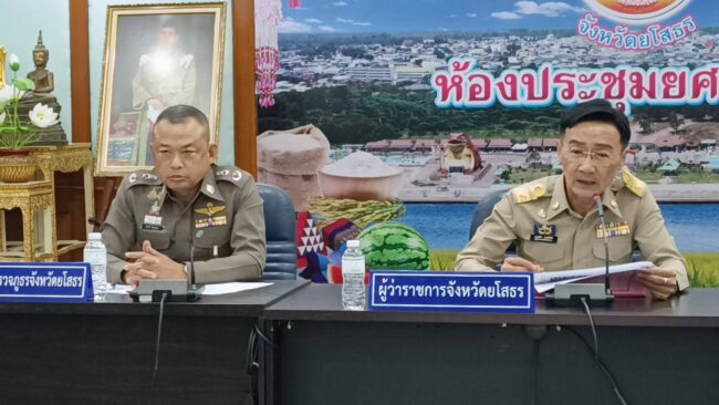 วันที่ 22 มกราคม 2568 เวลา 14.30 น. นายชาญชัย ศรศรีวิชัย ผู้ว่าราชการจังหวัดยโสธร แถลงแผนปฏิบัติการป้องกัน ปราบปรามและแก้ไขปัญหายาเสพติด จังหวัดยโสธร ประจำปีงบประมาณ พ.ศ. 2568 แผนยุทธการยศสุนทรพิทักษ์ ปฏิบัติการกวาดล้างยาเสพติด โดยมี รองผู้ว่าราชการจังหวัดยโสธร ผู้บังคับการตำรวจภูธรจังหวัดยโสธร รองผู้อำนวยการกองอำนวยการรักษาความมั่นคงภายในจังหวัดยโสธร (ฝ่ายทหาร) นายแพทย์สาธารณสุขจังหวัดยโสธร และปลัดจังหวัดยโสธร ร่วมเวทีแถลงข่าว และมีหัวหน้าส่วนราชการ นายอำเภอทั้ง 9 อำเภอ หน่วยงานที่เกี่ยวข้อง และสื่อมวลชนร่วมรับฟัง ณ ห้องประชุมยศสุนทร ศาลากลางจังหวัดยโสธร