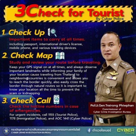 💢ในปัจจุบันแก๊งมิจฉาชีพ Scam Center มักจะตั้งฐานปฎิบัติการนอกพื้นที่ชายแดนที่ติดกับประเทศไทย หากท่านได้รับข้อความหรือโฆษณาชวนเชื่อ ที่เกี่ยวกับการทำงานในประเทศไทย โปรดตรวจสอบข้อมูลด้วยความระมัดระวังเป็นพิเศษ และเมื่อท่านเดินทางมาถึงประเทศไทย เพื่อความปลอดภัยของท่านไม่ให้ตกเป็นเหยื่อของกลุ่ม Scam Center เมื่อออกเดินทางทุกครั้งโปรดปฏิบัติ 3 Check ดังนี้