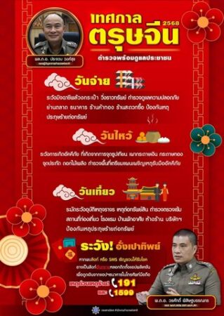 วันนี้ (26 มกราคม 2568) พ.ต.อ.วรศักดิ์ พิสิษฐบรรณกร รองผู้บังคับการสายตรวจและปฏิบัติการพิเศษ รักษาราชการแทนผู้บังคับการกองสารนิเทศ (รอง ผบก.สปพ.รรท.ผบก.สท.) เปิดเผยว่า ช่วงวันที่ 27-29 มกราคม 2568 เป็นเทศกาลตรุษจีนประจำปี 2568 โดยพี่น้องชาวไทยเชื้อสายจีนจะออกมาจับจ่ายซื้อของ เพื่อทำพิธีไหว้บรรพบุรุษ รวมทั้งเดินทางกลับภูมิลำเนาและท่องเที่ยวเฉลิมฉลองเป็นจำนวนมาก ดังนั้น เพื่อให้การป้องกันปราบปรามอาชญากรรม ดูแลความปลอดภัยในชีวิตและทรัพย์สินของประชาชน เป็นไปด้วยความเรียบร้อยและมีประสิทธิภาพตลอดห้วงเทศกาลตรุษจีน ทั้งวันจ่าย วันไหว้ วันเที่ยว สำนักงานตำรวจแห่งชาติ โดย พล.ต.อ.ประจวบ วงศ์สุข รองผู้บัญชาการตำรวจแห่งชาติ จึงกำชับให้หน่วยปฏิบัติดำเนินการตามมาตรการป้องกันปราบปรามอย่างเคร่งครัด