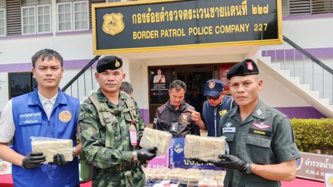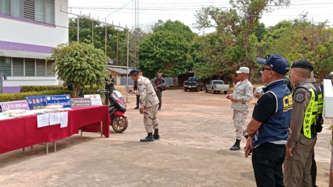 จุดสกัด เสี่ยงใจถึง ควบจักรยานยนต์ฝ่าวงล้อม เห็นจวนตัวรีบทิ้งของกลางลงข้างทางไม่วายโดนรวบจนได้ วันที่ 3 เมษายน 2568 ที่ กองร้อย ตชด.ที่ 227 ภายใต้อำนวยการโดย พล.ต.ต.ดร.กิตติศักดิ์ปลาทอง ผบก.ตชด.ภาค 2 นายรัฐพงศ์ รุ่งธนศักดิ์ นายอำเภอเขมราฐ พ.ต.อ.กวีพงษ์ ชลกาล ผกก.ตชด.22 พ.ต.อ.อดุลย์ สุรำไพ ผกก.สภ.เขมราฐ พ.ต.อ.อดิศักดิ์ มีศิลป์ผกก.10 บก.รน. พ.ต.ท.ศรีวิรัตน์ โพยนอก ผบ.ร้อย.ร้อยตชด.227 พ.ต.ท.พิจักษณ์ พงษ์บุปผา ผบ.ส.รน.4 กก.10บก.รน.หน่วยเรือรักษาความสงบเรียบร้อยตามลำแม่น้ำโข.(นรข)เขต อุบลราชธานี