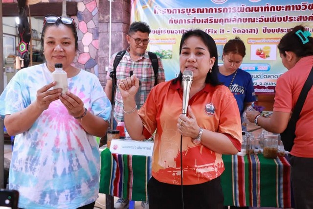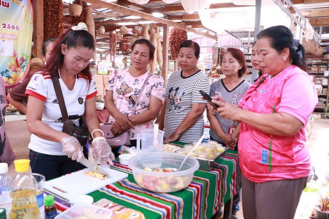 วันที่ 11 เมษายน 2568 วิทยาลัยอาชีวศึกษาอุบลราชธานี นำโดยนางสาวลฎาภา แสวงทรัพย์ ผู้อำนวยการวิทยาลัยอาชีวศึกษาอุบลราชธานี มอบหมายให้ นางศรีอุดร ศิริปริญญานันท์ รองผู้อำนวยการฝ่ายพัฒนากิจการนักเรียน นักศึกษา นางอรสา แถบเกิด หัวหน้างานโครงการพิเศษและบริการชุมชน นางเจมณี ทะริยะ ครูแผนกวิชาการโรงแรม วิทยากรให้ความรู้ และนักเรียนแผนกวิชาการโรงแรม ลงพื้นที่บริการวิชาชีพสู่ชุมชน สอนการทำอาหาร แก่ประชาชนเครือข่ายวิสาหกิจชุมชนเมืองม่วงหิมพานต์ ตลาดเมือเฮือน นำโดยนางรุ่งทิวา วอทอง ผู้นำวิสาหกิจชุมชนเมืองม่วงหิมพานต์ ตลาดเมือเฮือน ในระหว่างวันที่ 10-11 เมษายน 2568 ณ วิสาหกิจชุมชนเมืองม่วงหิมพานต์ ตลาดเมือเฮือน บ้านยางกะเดา ตำบลท่าเมือง อำเภอดอนมดแดง จังหวัดอุบลราชธานี
