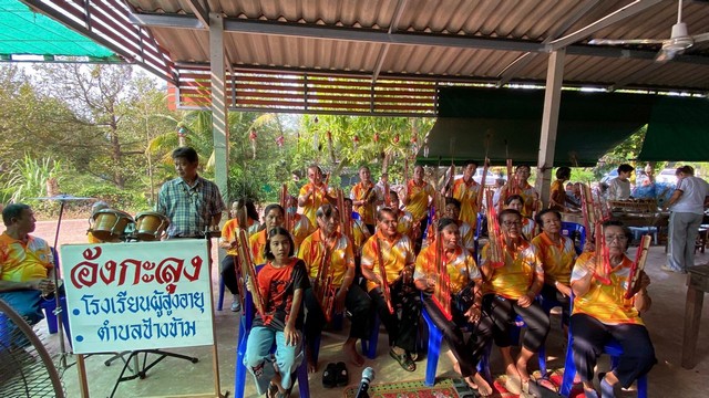คณะอังกะลุงโรงเรียนผู้สูงอายุ ตำบลช้างข้าม นำโดยอาจารย์สงบ พงษากิจ อดีตครูโรงเรียนวัดช้างข้าม และเป็นครูประจำโรงเรียนผู้สูงอายุตำบลช้างข้าม ซึ่งก็ได้สอนในการเล่นอังกะลุงให้กับนักเรียนที่โรงเรียนว่าจะข้ามมายาวนานจนเกษียณอายุก็ได้ออกมาสอน อังกะลุง ให้กับผู้สูงอายุ เพื่อสืบสานอังกะลุงให้อยู่คู่คนไทย และได้สอนผู้สูงอายุให้ทำกิจกรรมหลายอย่างแต่วันนี้ได้นำผู้สูงอายุมาเพื่อเล่นอังกะลุงในการทำบุญ 100 วันของนายมังกร เจตปรียากุล ซึ่งในคราวนี้ เข้าภาพก็ได้นำคณะอันตะลุงของผู้สูงอายุนำมาเล่นในงานทำบุญ ซึ่งทางเจ้าภาพได้หามาเล่นเพื่อจะสืบสานการเล่นอังกะลุงให้อยู่คู่ ซึ่งที่ผ่านมาหลาย 10 ปีแทบจะไม่มี การละเล่นอันก็ลงแบบนี้มาก่อนซึ่งเลือนหายไปจากชุมชน บ้านช้างข้าม การละเล่นดังณรงค์นั้น ได้สร้างความสนุกสนานความไพเราะ ของเสียงอันเบาลงที่ออกมาจากการเขย่า ที่ทำเป็นไม้ ให้มีเสียงดัง ตามโน้ต ให้บรรเลงเป็นเพลงต่างๆ ที่เป็นมนต์เสน่ห์ และสร้างมนต์ครั้ง ให้กับผู้ที่รับฟังและผู้ที่เล่นได้เพลิดเพลินในการเล่นอังกะลุง