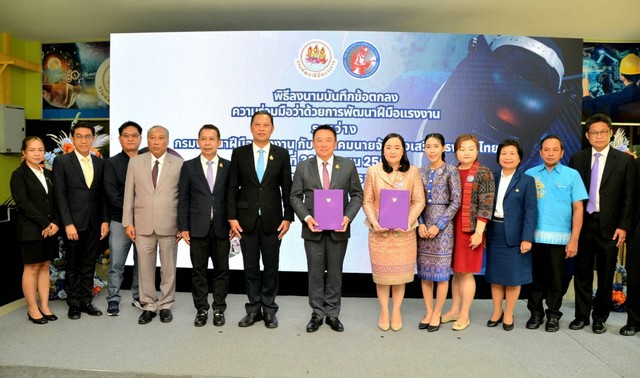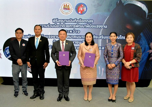 วันที่ 30 เมษายน 2568 กรมพัฒนาฝีมือแรงงาน ร่วมกับ สมาคมนายจ้างส่งเสริมแรงงานไทย พิธีลงนามบันทึกข้อตกลงความร่วมมือว่าด้วยการพัฒนาฝีมือแรงงาน ระหว่างนายเดชา พฤกษ์พัฒนรักษ์ อธิบดีกรมพัฒนาฝีมือแรงงาน นางสาวอรัญญา สกุลโกศล ประธานสมาคมนายจ้างส่งเสริมแรงงานไทย นางเบญจรงค์ สุระพันธ์ กรรมการสมาคมนายจ้างส่งเสริมแรงงานไทย โดยมีนายโกเมศ ปิยะพันธุ์ ผู้ตรวจราชการกรมพัฒนาฝีมือแรงงาน และนางเบญจรงค์ สุระพันธ์ กรรมการสมาคมนายจ้างส่งเสริมแรงงานไทย ร่วมเป็นสักขีพยาน ณ ห้องประชุมอาคารครัวไทย สู่ครัวโลก สถาบันพัฒนาฝีมือแรงงาน 3 ชลบุรี จังหวัดชลบุรี นอกจากนี้ยังเยี่ยมชมและให้กำลังใจผู้เข้ารับการฝึกอบรมหลักสูตรการเชื่อม FCAW 3G และ GTAW 6G(FCAW 3G and GTAW 6G WELDING) อีกด้วย