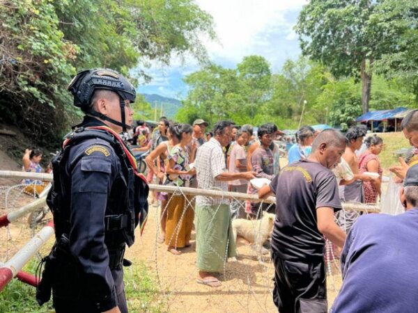 พันเอกสรรเสริญ ไพรโสภา ผู้บังคับชุดควบคุมกรมทหารพรานที่ 14 (ผบ.ชค.กรม ทพ.14) ลงพื้นที่พบปะ พูดคุย พร้อมทั้งมอบอาหารช่วยเหลือตามหลักมนุษยชน ให้แก่ผู้ลี้ภัยจากการสู้รบประเทศเมียนมา บริเวณพื้นที่ชายแดนไทย-เมียนมาร์ บ้านพุน้ำร้อน ต.บ้านเก่า อ.เมือง จ.กาญจนบุรี