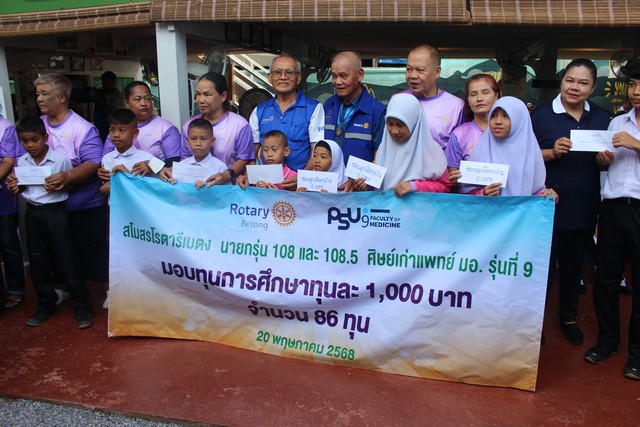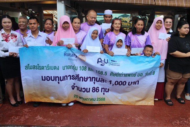 วันนี้ (20 พ.ค.68) ที่ศูนย์ประสานงานกิจกรรมกลางแจ้ง (บ้านเขียว) ซึ่งตั้งอยู่ตรงข้ามศาลจังหวัดเบตง อ.เบตง จ.ยะลา นางชนิษฐ์ภัค กัลยาพิเชฏฐ์ อดีตนายกสโมสรโรตารีรุ่น 108 พร้อมเพื่อน ศิษย์เก่าแพทย์ มอ. รุ่น 9 และสมาชิกสโมสรโรตารีเบตง ร่วมมอบทุนการศึกษาให้แก่นักเรียนที่เรียนดี มีความประพฤติที่ดี แต่ขาดแคลนทุนทรัพย์จำนวน 94 ทุน ทุนละ 1,000 บาท จาก 25 โรงเรียนในอำเภอเบตง เพื่อเป็นกำลังใจและสนับสนุนการศึกษาให้แก่นักเรียนที่มีความตั้งใจและมุ่งมั่น