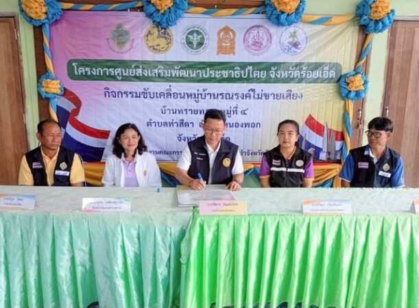 อีกทั้งยังเป็นการแสดงออกถึงความบริสุทธิใจให้คำมั่นสัญญาพร้อมทั้งกล่าวปฏิญาณตนไม่ขายสิทธขายเสียงเหลือกตั้ง โดยมีการร่วมลงนามMOU กับุกภาคส่วนราชการ จากนั้นนายพัสกร ธนแสนไทย นายอำเภอหนองพอก ประธานในพิธิเปิดงานได้มอบหนังสือประกาศเกรียติ คุณให้กับนายวิกุล โคตา กำนันตำบลท่าสีดา นายนิคม คูนอาจ ผู้ใหญ่บ้านทรายทองเพื่อแสดงว่าหมู่บ้านนี้ไมขายสิทธขายเสียงเป็นแบบอย่างที่ดีต่อไป