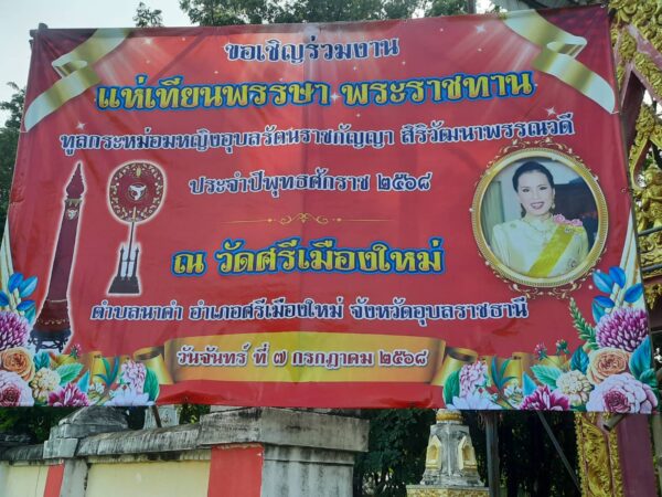 ชาวอำเภอศรีเมืองใหม่ ต่างปลื้มปิติยินดี เป็นพระมหากรุณาธิคุณอย่างล้นพ้น ที่ได้รับพระราชทาน เทียนพรรษา จากทูลกระหม่อมหญิง อุบลรัตน์ ราชกัญญา สิริวัฒนาพรรณวดี ซึ่งพระราชทาน ให้วัดศรีเมืองใหม่ ตำบลนาคำ อำเภอศรีเมืองใหม่ จังหวัดอุบลราชธานี โดย ท่านพระครูโสภณนพรัตน์ ได้ รับพระราชทานพัดรอง เชิญพระนามย่อ อร. ปักบนพัดรองจากพระหัตถ์ ของพระองค์ ในวันเสาร์ ที่ 5 กรกฎาคม พุทธศักราช 2568 ณ มณฑลพิธีหน้าองค์หลวงพ่อโต วัดอินทรวิหาร พระอารามหลวง แขวงบางขุนพรหม เขตพระนคร กรุงเทพมหานคร โดยมี นายกิตติศักดิ์ ประดับศรี นางนงนุช ประดับศรี และ นายเด่นชัย สุขแสวง ผู้อำนวยการโรงเรียนบ้านชาด ทำหน้าที่เป็น ผู้แทนกองงานเผยแผ่และส่งเสริมประเพณี ถวายเทียนพรรษาพระราชทานวัดอินทรวิหาร อารามหลวง แขวงบางพรหมกรุงเทพมหานครเป็นผู้เชิญต้นเทียนพระราชทานมา ถึงวัดศรีเมืองใหม่เพื่อทำพิธีถวายเทียนเข้า