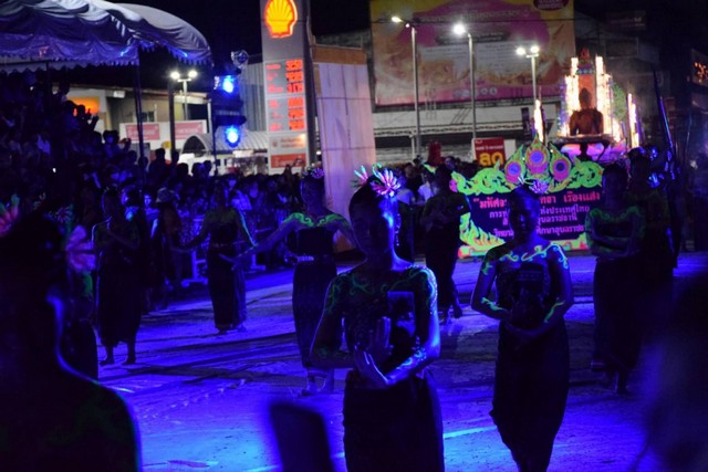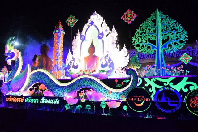 4.ส่วนท้ายขบวนจำลองต้นกัลปพฤกษ์จากวัดภูพร้าว (วัดสิรินธรวรารามภูพร้าว) เป็นงานศิลปะเรืองแสงที่โดดเด่นและเป็นที่รู้จักในชื่อ “วัดเรืองแสง”