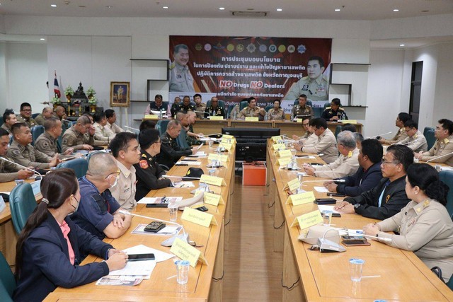 โดยมี หัวหน้าส่วนราชการ ข้าราชการ อัยการ ทหาร ตำรวจ นายอำเภอทั้ง 13 อำเภอ ตลอดจนเจ้าหน้าที่ที่เกี่ยวข้องในจังหวัดกาญจนบุรี เข้าร่วมรับมอบนโยบายฯรัฐบาลได้กำหนดนโยบายเร่งด่วนในห้วงระยะเวลา 3 เดือน โดยมีเป้าหมายและแนวทางการขับเคลื่อนปฏิบัติการกวาดล้างยาเสพติดภายใต้ชื่อปฏิบัติการว่า No Drugs No Dealers โดยการผนึกกำลังทุกภาคส่วนเพื่อทำให้หมู่บ้าน ชุมชน ปลอดยาเสพติด ภารกิจสำคัญ คือการค้นหาผู้เกี่ยวข้องกับยาเสพติด ทั้งผู้ค้า ผู้เสพ ผู้ติด ผู้สนับสนุน นำเข้าสู่กระบวนการทางกฎหมาย ทั้งการดำเนินคดี การบำบัดฟื้นฟู การสร้างระบบการติดตามและการเสริมสร้างความเข้มแข็งไปสู่หมู่บ้าน ชุมชน ปลอดยาเสพติดอย่างยั่งยืนให้ได้อย่างเป็นรูปธรรม ซึ่งสัปดาห์ที่ผ่านมาได้มีการมอบนโยบายและแนวทางในการปฏิบัติการ โดยรองนายกรัฐมนตรีและรัฐมนตรีว่าการกระทรวงมหาดไทย รักษาราชการแทนนายกรัฐมนตรี นายภูมิธรรม เวชยชัย