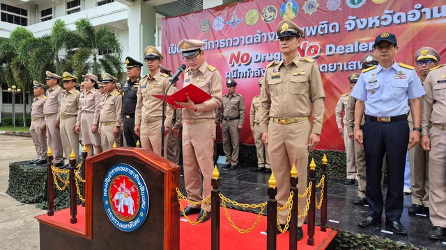 ภายใน 3 เดือน เปิดปฏิบัติการ No Duck No Dealerเดินหน้าผนึกกำลังชุมชน สร้างพื้นที่ปลอดยาเสพติดอย่างยั่งยืนภายใน 3 เดือน วันที่ 23 กรกฎาคม 2568 เวลา 15.00 น.ที่บริเวณหน้าศาลากลางจังหวัดอำนาจเจริญ นายณรงค์ เทพเสนา ผู้ว่าราชการจังหวัดอำนาจเจริญ เป็นประธานในพิธีปล่อยแถวเจ้าหน้าที่ปฏิบัติการกวาดล้างยาเสพติด NO Drugs NO Dealers ผนึกกำลังชุมชน ปลอดยาเสพติด โดยมีนายเสนีย์ ส้มเขียวหวาน นายเทพรัตน์ ตันตยานนท์ รองผู้ว่าราชการจังหวัดอำนาจเจริญ