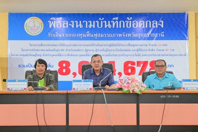 จึงได้จัดพิธีลงนามบันทึกข้อตกลง (MOU) การรับเงินกองทุนฟื้นฟูสมรรถภาพจังหวัดอุบลราชธานี รวมงบประมาณที่สนับสนุน เป็นเงินทั้งสิ้น 8,074,678.-บาท ////////////