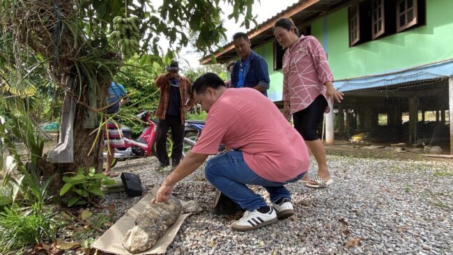 วันที่ 29 กันยายน 2568 ไปบ้านเลขที่ 43 หมู่ 10 ตำบลช้างข้าม อำเภอนายายอาม จังหวัดจันทบุรี ไปพบกับคุณนุชสรา เจริญมี และนายณรงด์เดช ผ่องมณี ผู้ใหญ่บ้าน หมู่ 10 ตำบลช้างข้าม นายทวัศักดิ์ นุ่มหยุ่น ผู้ใหญ่บ้านหมู่ 2 ตำบลช้างข้าม และชาวบ้านในระแวกนั้น เขามาขอดูอัมพันทะเล ซึ่งขอทราบจากมีผู้โพสต์ใน Facebook มีคนเจออำพันทะเล จึงได้ขอชม อำพันทะเลซึ่งได้นำมาเก็บไว้บนบ้านและได้นำลงมาให้ชมกันที่ข้างล่างเพื่อให้ชาวบ้านที่ได้ข่าวมาขอชมและดู ซึ่งชาวบ้านเองก็ไม่เคยเห็นอำพันทะเลเหมือนกัน ซึ่งลักษณะอัมพันทะเล เป็นก้อนเรียวยาวหนึ่งก้อนและก้อนเล็กอีกหนึ่ง ก้อนใหญ่หนักประมาณเก้ากิโลครึ่ง ถ้ารวมก้อนเล็กเข้าไปด้วยก็จะประมาณ 10 กิโลครึ่ง ลักษณะอำพันที่พบ เป็นลักษณะก้อนเรียวยาว สีดำปกคลุม และอีกหนึ่งก้อนลักษณะเป็นก้อน สีคล้ายคลึงกัน ซึ่งผู้ที่พบอำพันทะเล คือคุณนุชสรา เจริญมี ซึ่งเป็นเจ้าของและผู้ที่พบอำพันทะเล เล่าให้ฟังก่อนจะเจออำพันทะเล ได้ฝันเห็นไหทองคำ และผ่านมาได้ 2-3 วัน ตนก็ได้เดินทางไปหาหอยซึ่งเป็นหน้าหาดบ้านแหลมแม่นกแก้ว หน้าศาลสมเด็จพระเจ้าตากสินมหาราชบริเวณ ในพื้นที่หมู่ที่ 10 ตำบลช้างข้าม อำเภอนายายอาม จังหวัดจันทบุรี ในขณะที่เดินหาหอยอยู่ริมชายหาด ชายทะเลตามพื้นทรายและตามหินโสโครกที่มีอยู่มากในบริเวณนั้น อยู่ๆสายตาก็เหลือบไปเห็นน้ำ กระเพลิ่มๆ คล้ายกับก้อนอะไรอยู่ในซอกหิน จึงเดินเข้าไปดู เห็นเกยอยู่แถวซอกหินที่หาด