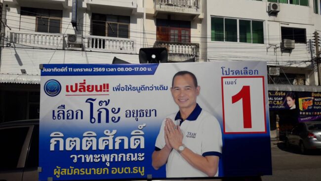 ผู้สมัครนายก เลือกโก๊ะ อบต. ธนู โปรดเลือก เบอร์ 1 วันนี้ เดินหาเสียง หมู่ที่ 1 อุทัย ตลาดแกรนด์ มีประชาชน ให้ความสนใจ สโลแกน เปลี่ยน เพื่อให้อบตธนู ดีกว่าเดิม คบง่าย น้ำไหลไฟสว่าง ถนนดี มีปัญหา แก้ไขทันที โปรดเลือกยกทีม วันอาทิตย์ที่ 11 มกราคม 69 เวลา 0.8 00 น.ถึง 17:00 น. ไปเข้าคูหา ใช้สิทธิ์