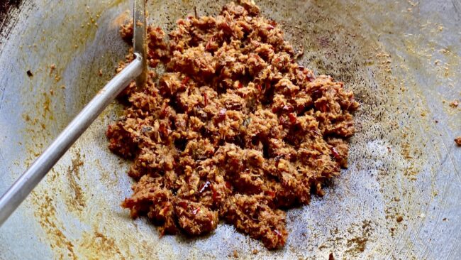 กระบวนการการทำน้ำพริกปลาหมอคางดำ เริ่มจากการนำปลาฯ มาทอดให้เหลือง แล้วนำมาแกะเนื้อปลาออก การแกะต้องแกะให้ละเอียดนะ ไม่งั้นจะมีกั้งติดมา ปลานี้เค้าขึ้นชื่อเรื่องเยอะอยู่แล้ว นำเครื่องเคียงมาผสมคือนำพริก-กระเทียม-น้ำมะขามเปียก หยิบเนื้อปลาโครกในครกให้ละเอียดให้ผสมเป็นเนื้อดียวเข้ากัน แล้วก่อไฟเตาถ่าน รสชาติจะอร่อยกว่าเตาแก๊ส เนื่องจากเป็นไฟที่อ่อนและรสชาติของอาหารจะหอมขึ้น แล้วหยิบกระทะตั้งกระทะโดยใช้ไฟปานกลาง เมื่อกระทะร้อนแล้วนำน้ำมันพืชหรือน้ำมันหมูก็ได้ใส่ลงไป ในกระทะพอประมาณให้ชลนำเนื้อปลาที่โขลกไว้รอ ใส่ลงในกระทะร้อน คั่วไปเรื่อยๆให้หอมปรุงแต่งรสด้วยน้ำตาลน้ำปลา-ซอสให้พอเหมาะ ค่อยๆคั่วไปเรื่อยๆ คอยชิมรสชาติให้พอเหมาะ กลิ่นหอมของการคั่ว จะส่งกลิ่นหอมตะหลบ อบอวล เมื่อได้ที่ก็ให้ยกลง เพื่อให้เย็นตัวลงสักหน่อย นำบรรจุผลิตภัณฑ์ ติดสติกเกอร์ นำออกขายเป็นรายได้สำหรับผู้ที่ขาดรายได้ จะได้มีแนวคิด และสูตรการทำเมนูนี้
