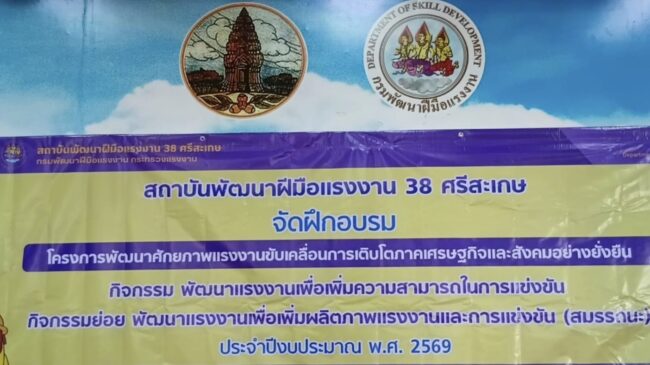 ศรีสะเกษ นายสันติพงษ์ สุชะไตร 17 ธันวาคม 68 เวลา 08.30 น.ประธานพิธีเปิดอบรมโครงการพัฒนาศักยภาพแรงงานขับเคลื่อนการเติบโตภาคเศรษฐกิจและสังคมอย่างยั่งยืน กิจกรรมพัฒนาแรงงานเพื่อเพิ่มความสามารถในการแข่งขัน กิจกรรมย่อยพัฒนาแรงงานเพื่อเพิ่มผลิตภาพแรงงานและการแข่งขันสมรรถภาพ ประจำปีงบประ