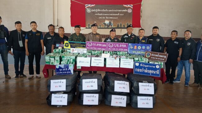วันที่ 3 มีนาคม 2569 ที่ กองร้อยตชด.227 อ.เขมราฐ จ.อุบลราชธานี พ.ต.อ.คณิต กลิ่นศรีสุข รอง ผบก.ตชด.ภาค 2 พ.ต.อ.กวีพงษ์ ชลการ ผกก.ตชด. 22 พ.ต.ท.จารุบุตร เรืองศรี รอง ผกก.ตชด. 22 พ. ต.ท.ปรัชญลักษณ์ วิลาทัน รอง ผกก.หน.ร้อย ตชด. 234 พ.ต.ท.ไสว สอนทุย ผบ.ร้อย ตชด. 227 พ.ต.ท.วัฒนพล ดาแก้ว ผบ.ร้อย ตชด. 234 พร้อมหน่วยตำรวจ ทหารทุกหมู่เหล่า ในเขตรับผิดชอบ เปิดการแถลงถึงผลของการที่ได้สนธิกำลังกันเข้าสกัดจับกุม 3 ผู้ต้องหา ในขณะลักลอบขนยาเสพติด ไอซ์ จำนวน 380 ห่อ ประมาณ 380 กิโลกรัม ได้ที่ บริเวณ ถนนชยางกูร ทางหลวงหมายเลข 212 ก่อนถึง 4 แยกไฟแดงโคกสูง ประมาณ 300 เมตร พื้นที่ของหมู่ที่ 3 ต.บางทรายใหญ่ อ.เมืองมุกดาหาร จ.มุกดาหาร